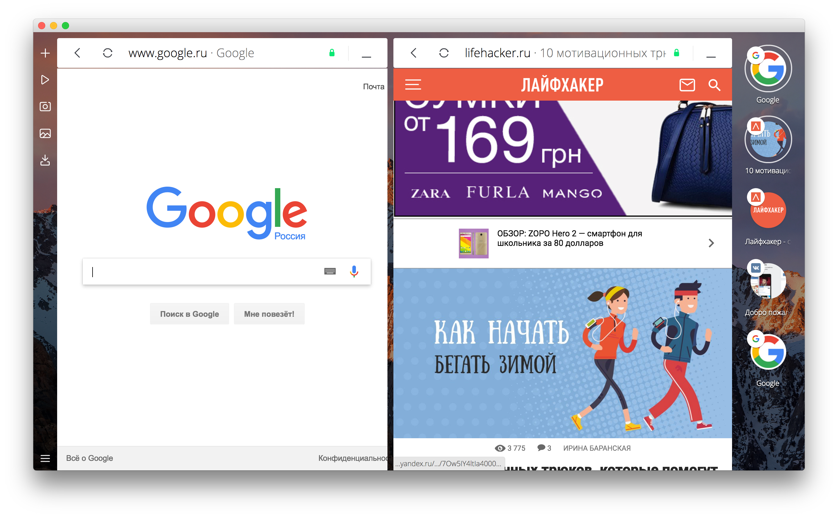 По мнению разработчиков, сам процесс сёрфинга должен проходить в некой отдельной уютной «комнате», в которой всё лежит на своих местах, а интерьер вызывает восторг. Именно поэтому сразу после запуска Opera Neon нас встречает программное окно с родными обоями операционной системы macOS Sierra.