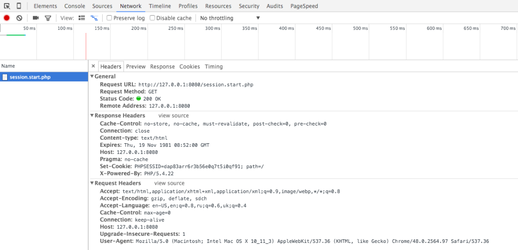 Зайдите в браузере на страницу http://127.0.0.1:8080/session.start.php, вы должны увидеть лишь пустую страницу, но не спешите закрывать – откройте Developer Tools (или что там у вас) и обновите страницу, и посмотрите на заголовки которые нам прислал сервер:
